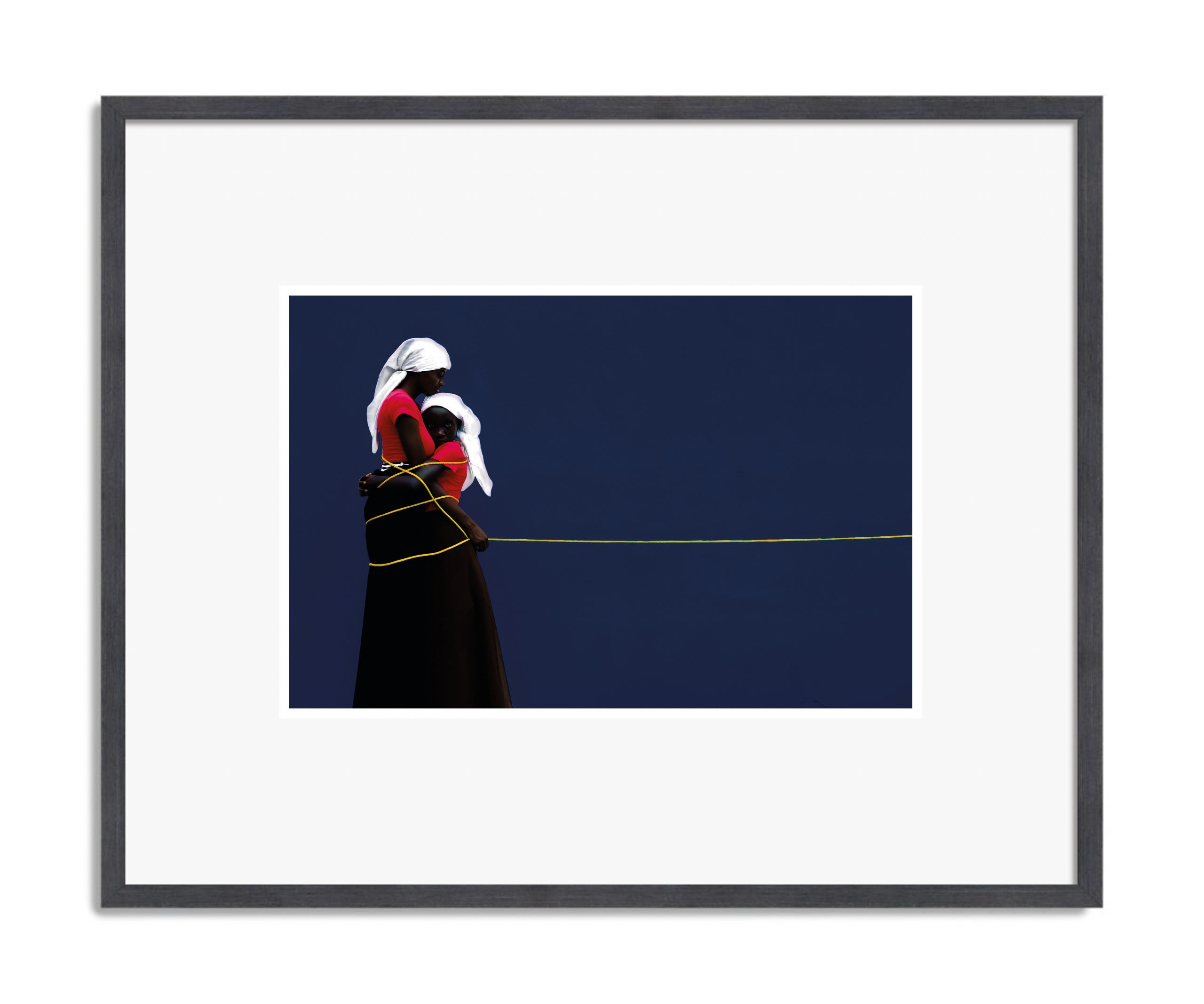 “This artwork captures the essence of care, resilience, and the silent promises we make to protect those we hold dear. It reminds us that love often carries a dual nature: it holds us close, yet ties us to a legacy and a future we are bound to shape together. The rope that wraps around them hints at the complexities of family, tradition, and the responsibilities that come with nurturing and guidance. The rope line extending outward suggests a link to a larger world-perhaps a reminder that, though bound together, they are also connected to something beyond themselves. Set against a green background which represents warmth and unity”. – Sarfo Emmanuel